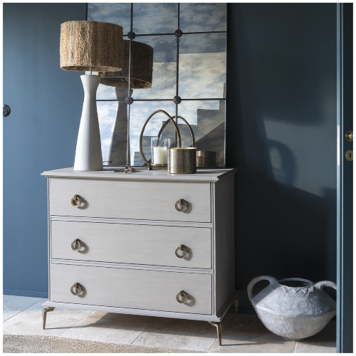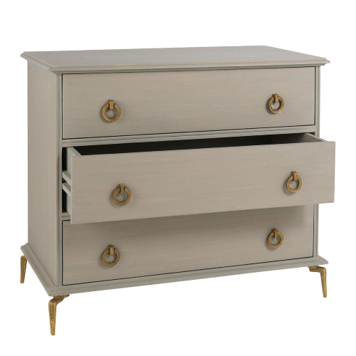 Entirely handmade, the classic curves of the GABRIELLE mango wood chest of drawers are enhanced by a handcrafted gray patina and the luminous brass touches of its legs and handles.