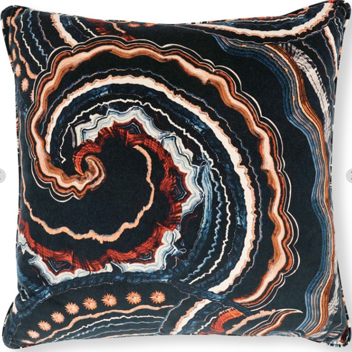 A sumptuous, deep pile velvet cushion featuring a hypnotic display of agate inspired swirls that exudes a psychedelic sophistication.