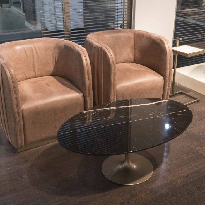 Round tables with metal base in hi gloss or matte finish. Please specify any RAL or Pantone color. Top in any available natural stone finish with thin knife edge.