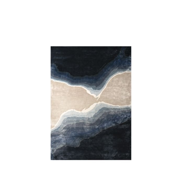 Waves of rich, gorgeous colour from the inkiest of indigos, through a myriad of blue tones to neutral combine to form this organically patterned and dramatic design. Hand tufted using particularly dense pure wool and viscose yarns.