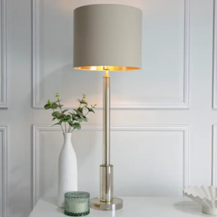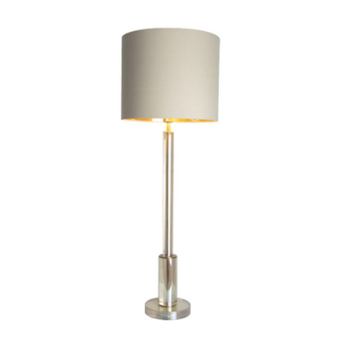 An elegant, tall table lamp, the Jae Table lamp is impressive with its cognac crystal and antique brass finish. The soft latte shade is a superb match, and the gold lining elegantly radiates warmth.